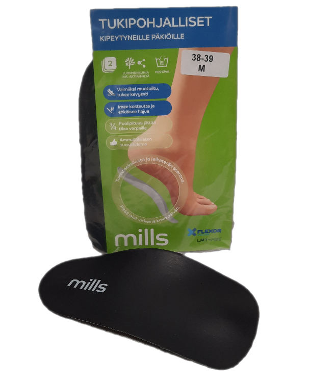 - Laadukkaiden Mills pohjallisten säännöllinen käyttö lievittää päkiä, kantapää-, polvi- ja selkäkipuja sekä ehkäisee jalkaongelmien syntymistä.